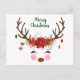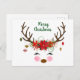 Este adorable diseño de Navidades es un rostro único de reno y unas coronas con una corona de poinsettias. Los ornamentos cuelgan de los cánticos y el reno tiene unas mejillas y unos azotes rosas. Puedes personalizar el texto para decir algo más como "Saludos de temporada" o "Felices fiestas". También puede personalizar el tipo de letra y el color. Obra de arte de digital curio.