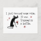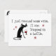 "Acabo de rescatar un poco de vino. Estaba atrapado en una botella", dice este gato negro hipster, dibujado a mano, conocido como El gato Cabernet. Le gusta pensar que tiene una graciosa cita del vino para cada ocasión, ya sea un fiesta de la Noche de las Damas, una recepción para la nueva tienda de regalos de tu bodega y un bar de cata de vinos, o una noche tranquila en casa con ti, tu gato y una copa de tu rojo favorito. Quizás hoy envies esta excelente postal a un amigo o a un ser querido.