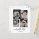 Esta sencilla pero ultramoderna boda, salvo la postal de fecha, incluye cuatro de tus fotos personales favoritas en una única rejilla de fotos de apariencia estratificada. El diseño de la tarjeta en blanco y negro presenta una tipografía de escritura manuscrita elegante y moderna, y tiene un lugar para la información de su boda en un tipo de letra sans serif de coordinación.