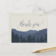 Este retiro a las montañas gracias postal es perfecto para un boda moderno. El diseño cuenta con una serena cordillera de color azul con un bosque de árboles verdes en primer plano. Personaliza la parte posterior de la tarjeta postal con tus nombres, tu dirección de retorno y un mensaje de agradecimiento. Como alternativa, deje en blanco la sección de plantillas de mensajes de agradecimiento para escribir a mano una nota personalizada cuidadosa en cada tarjeta después de su llegada. Estas tarjetas se pueden usar para un boda, una ducha de novia o cualquier evento especial.