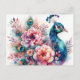 Postcard cuenta con acuarela floral de arte de un pavo real entre grandes flores con una delicada estética femenina. Un retrato de pájaro exótico y vibrante con grandes flores rosadas y melocotones que contrasta con los tonos azules y azules-verdes del pavo real con toques de morado.