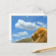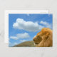 Lion está inspeccionando su dominio de la ladera de las hierbas. Nubes blancas onduladas en el cielo azul.