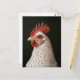 Un retrato hiperrealista de un pollo manchado con plumas rojas y blancas, cresta y barbillas detalladas, sobre un fondo oscuro.