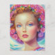 Impresionante retrato de fantasía de una mujer adornada con una corona de flores vívida y tonos pastel brillantes. Sus luminosos ojos azules y su suave expresión se complementan con una delicada mariposa y un florido aura de arcoiris. Este ilustracion de ensueño combina belleza, naturaleza y elegancia surrealista.