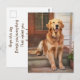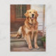 Esta postal presenta a un hermoso retriever dorado esperando a que su dueño vuelva a casa.