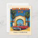 Un Cadillac rojo vintage cruza hacia la icónica entrada del muelle de Santa Mónica bajo un cielo azul brillante, evocando los clásicos vibrantes de California.