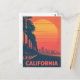 Envíe un pedazo del Estado Dorado con esta postal de estilo retro. Cuenta con un ilustracion vibrante de una escena clásica de California, con una carretera bordeada de palmeras que conduce a un horizonte urbano al atardecer. Esta postal es perfecta para compartir las vibraciones soleadas de California con amigos y familia, como recuerdo de un viaje, o como una pequeña huella de arte para tu casa. El diseño vintage añade un toque fresco y nostálgico que seguro será apreciado.