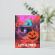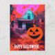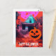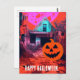 Postal Retro embrujado Halloween Casa Naranja Rosa Azul