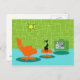 Se dice que los perros tienen propietarios y que los gatos tienen personal. ¡El felino de esta postal de la era retro espacial Kitty no pudo estar más de acuerdo! El estilo de los años 60, de diseño artístico minimalista, cuenta con un elegante gato negro en una sala de estar moderna de mediados de siglo. La sofisticada sala cuenta con una pared de piedra verde. La moqueta es aqua con sombras verde azuladas. El mobiliario de la habitación incluye una luz amarilla y sputnik, una tumbona naranja con una banqueta a juego y un televisor verde con orejas de conejo. El afortunado gato negro se puede ver encaramado en el taburete delante del televisor. ¡Su programa favorito está! En la pantalla de televisión podemos ver a una familia de televisión clásica en blanco y negro resolviendo todos los problemas de la vida en un programa de media hora. Este diseño es perfecto, si lo decimos nosotros mismos.
