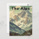 Escape to the mountains with this classic 'The Alps' Vintage Travel print. This Mid-Century Modern illustration captures a majestic, snow-capped peak rising above a valley, complete with a cozy ski lodge cabin nestled among the pine trees.