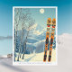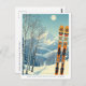 Hello from the snowy mountains of Revelstoke British Columbia Canada! We hope you're having a wonderful ski vacation. This postcard features a gorgeous blue-grey mountain landscape with retro ski boards in an orange tribal pattern.