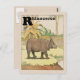 R es para el animal del alfabeto rinoceronte que camina al borde de un agujero de agua rodeado de palmeras en la selva africana. Aprende los ABC con un dibujo del artista francés Benjamin Rabier.