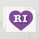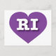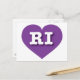 Esta postal contiene un vibrante corazón morado que contiene las letras negrita, blanca y alta del funda RI, la abreviatura oficial de Rhode Island, el estado del océano. El reverso de la tarjeta está en blanco, esperando tu texto personalizado o tus sentimientos escritos a mano.