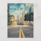 The image captures a San Francisco street lined with tall buildings, showcasing a sense of tranquility and solitude. The street is paved with asphalt and marked with two bright yellow lines down the center, leading the viewer's eye towards the distant cityscape. The buildings on either side of the street are a mix of modern glass structures and older brick buildings, creating a visual contrast.