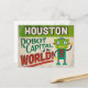Una divertida postal de viaje vintage de Houston Texas con un simpático robot con divertido texto de estilo retro que dice: "¡Houston, capital robótica del mundo!"