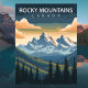 Celebrate the wild beauty of the north with this stunning Rocky Mountains Travel Card. This vintage-style illustration captures the dramatic, sun-drenched peaks of the Canadian range as they rise above a deep valley of towering pine and fir trees under a moody mountain sky.