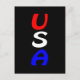 "USA", la abreviatura de los Estados Unidos de América, en letras brillantes rojas, blancas y azules contra una postal colectiva negra.