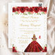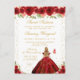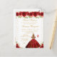 Esta elegante y glamurosa invitación de cumpleaños de dulces dieciséis presenta a una hermosa princesa con cabello rubio y piel clara en un vestido de gala rojo. El texto combina la escritura a mano y las fuentes modernas sans serif para un aspecto clásico y sofisticado. Las disposiciones florales, las mariposas y el confeti dorado crean la mezcla perfecta de rústico y chic.