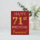 Este diseño de tarjeta postal de cumpleaños personalizada simple presenta el mensaje "FELIZ 71º CUMPLEAÑOS", con el "71º" teniendo una apariencia similar al oro. La parte delantera también presenta un nombre personalizado y un fondo rojo. La parte trasera presenta un mensaje de felicitación de cumpleaños personalizado, junto con la dirección personalizable del destinatario de la tarjeta postal de cumpleaños. Podría ser enviada a alguien que esté celebrando su septuagésimo primer cumpleaños. [~Z0000071]