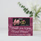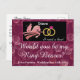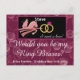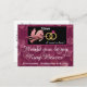 Un buen caballero con una brillante y brillante armadura listo para llevar los anillos a la novia y al novio. La carta muestra al caballero sobre su caballo sosteniendo una lanza y apuntando a los anillos dorados. El fondo está formado por grandes burbujas de champán Rosa y un fondo de color burdeos. Puede editar el mensaje detrás de la tarjeta o guardar las palabras. Está listo para ser publicado.