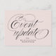 ¿Necesita cancelar o posponer su evento debido a circunstancias desafortunadas? Desastres como pandemias, condiciones meteorológicas severas, enfermedades, muerte pueden asestar un golpe aplastante a un día importante. Envíe un aviso a sus amigos, familiares y asociados con esta postal sencilla y de buen gusto. En la parte trasera se incluye un gran bloque de texto personalizado con la redacción sugerida. También puedes firmarlo. Se puede editar el esquema de color de color con el clic en "personalizar más adelante". También trabaja para otros eventos que necesitan ser pospuestos como fiestas de graduación, paseos, recaudaciones de fondos, galas, reuniones familiares y más.