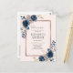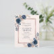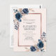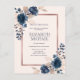Infórmese de su cambio de fecha con esta postal de invitación moderna y a la moda con flores de color rosa en azul marino y rosa polvoriento, con una caja de texto de imitación de Relieve metalizado de oro rosa. Copyright Elegant Invita, todos los derechos reservados.