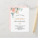 Una elegante invitación para una fiesta de cumpleaños número 50 (o cualquier edad). Un fondo blanco moda. Decorada con una flor rosa de color oro rosa y rosa y rosa, con hojas de eucalipto verdes, florales, verdes, escarabajos, vegetación y una falsa primavera dorada. Personalizar y el nombre y los detalles del fiesta. Letras negras y doradas. El nombre está escrito con una escritura de estilo con letras a mano moderna. Parte posterior: color de fondo dorado rosa, diseño postal. Sugerencia: Si no desea que se vea como una postal, haga clic en personalizar, vaya a la parte posterior y quite el separador y el sello postal.