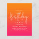 ¡Celebra tu cumpleaños con un estilo audaz y hermoso! Esta invitación de cumpleaños personalizada impresa en una postal hace exactamente eso con sus colores gradientes naranja intenso y rosa caliente mezclados con texto moderno blanco y un acento de letra manuscrita que deletrea la palabra "cumpleaños" en un estilo fabuloso. ¡Los colores se asemejan a una salida del sol y al amanecer de una nueva era! Estas invitaciones se pueden pedir en formatos digitales de descarga instantánea e impresos.