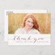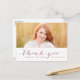Graduación De Foto De Faux Rosa Gold Script De Moda A Mano Gracias Postcard. Diseño de Elke Clarke © Visite nuestra tienda www.zazzle.com/monogramgallery* para más colores y estilos. Añade tu propia foto y texto. Una simple tipografía de oro rosa de moda se apodera de un fondo blanco con las palabras "Gracias". Reemplace la foto de ejemplo con la suya propia.