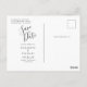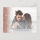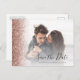 Esta elegante tarjeta postal horizontal guarda la fecha con un borde falso rosa de purpurina de oro. Reemplace fácilmente la imagen de muestra con su propia foto de la futura novia y novio. El texto del personalizable combina secuencias de comandos de escritura a mano sin negro y fuentes de copperplate; un filtro de gradiente blanco ayuda a hacer que el texto aparezca. Agregue su dirección de retorno y detalles adicionales al reverso en negro apagado.