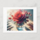 Una rosa roja vibrante, con un fuerte giro en su centro, es el punto central de un ramo de madera bellamente arreglado en un jarrón de plata reflexivo. Rodeado de rosas incipientes y flores de relleno, el ramo se sienta en una mesa de madera junto a una colección de pinceles, disfrutando de una luz suave y cálida. Arte creado por Arlene usando Dall-e-3 y Photoshop.