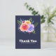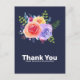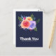 Una tarjeta postal de agradecimiento de fiesta con un bonito ramo de rosas acuarela con ramitas, hojas y ramas todas juntas en un colorido arreglo floral. Fondo azul marino. Mensaje personalizado en el reverso.