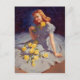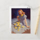 Tarjeta clásica PinUp que muestra a un hermoso Chica PinUp posando en el suelo con un vestido blanco y un ramo de rosas amarillas, pintado por Art Frahm (1907-1981)