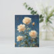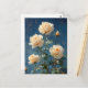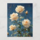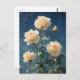 Una elegante pintura al óleo que captura cremosas rosas blancas en plena floración contra un fondo azul marino profundo. Las pinceladas ricamente texturadas resaltan la suavidad de los pétalos y el contraste con las hojas verdes exuberantes, creando una composición floral atemporal.