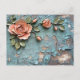 Una elegante pintura con cuchillo de paleta con rosas de coral rosado y hojas verdes esculpidas en gruesas pinceladas de textura contra un afligido fondo verde azulado y de madera. El efecto patina agrietada le da un encanto rústico, perfecto para una decoración de inspiración vintage, estética de cabaña o una colección de arte de una casa de campo.
