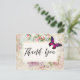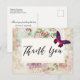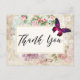 Fiesta gracias postal con una elegante mariposa magenta rosa con acentos púrpura. Un marco blanco con un borde de color dorado está recubierto por encima de un collage vintage poco vistoso con rosas rosas rosas rosas y otros elementos decorativos. Una moda anticuada. Gracias escrito en un tipo de letra de guión moderno. Personalice el mensaje con su propio mensaje (y la dirección de retorno) en la parte posterior o deje el mensaje tal como está.