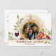 La postal Shanah Tovah presenta un marco central circular - un espacio para la foto personalizado. Alrededor del marco se encuentran ilustraciones de símbolos tradicionales de Rosh Hashanah: una taza Kiddush llena de vino tinto, manzanas y granadas. La parte superior de la tarjeta está decorada con un diseño ornamentado que incluye ramas de olivo y hojas. Debajo del marco central, el texto "Shanah tovah um’tukah" está escrito en un guión elegante, seguido de "De: [nombre propio] Familia". En el reverso de la tarjeta postal, hay un espacio para el texto del personalizable Los símbolos descritos son elementos tradicionales asociados con deseos de un año nuevo dulce y próspero.