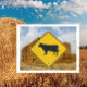 Fotografía de un letrero cruzando ganado en Utah sobre una imagen de fondo de heno calvo, apilado con un cielo azul, nubes esponjosas. Cruzando el ganado, imagen copyright 2016 de Margaret E. Cmelik.