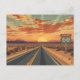 This retro-inspired illustration captures the iconic Route 66 desert road at sunset, featuring a long, straight highway leading to a glowing horizon. Warm oranges, reds, and yellows contrast with muted mountains and desert vegetation, creating depth and nostalgia. The classic Route 66 sign adds a timeless Americana touch. Perfect for travel enthusiasts, road trip lovers, and fans of vintage desert landscapes and scenic open-road art.