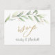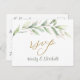 Elegante postal RSVP con un ilustracion acuático de follaje verde y dorado.