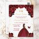 Esta elegante y glamurosa invitación de cumpleaños de dulces dieciséis años presenta a una hermosa princesa con cabello moreno en un vestido de baile rojo burgundy. El texto combina letra manuscrita y fuentes sans serif modernas para un aspecto clásico y sofisticado. Los arreglos florales, la mariposa y el confeti dorado crean la mezcla perfecta de rústico y chic.