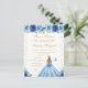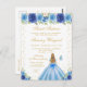 Esta elegante y glamurosa invitación de cumpleaños de sweet sixteen presenta a una hermosa princesa con cabello rubio y piel clara con un vestido de baile azul. El texto combina la escritura a mano y las fuentes modernas sans serif para un aspecto clásico y sofisticado. Los arreglos florales, las mariposas y el confeti dorado crean la mezcla perfecta de rústico y chic.