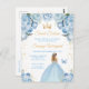 Esta elegante y glamurosa invitación de cumpleaños de dulces dieciséis presenta a una hermosa princesa con cabello rubio en un vestido de gala azul claro. El texto combina la escritura a mano y las fuentes modernas sans serif para un aspecto clásico y sofisticado. Los arreglos florales, la mariposa y el confeti dorado crean la mezcla perfecta de rústico y chic.