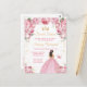Esta elegante y glamurosa invitación de cumpleaños para sweet sixteen presenta a una bella princesa con cabello castaño en un vestido de baile rosa pálido. El texto combina letra manuscrita y fuentes modernas sans serif para un look clásico y sofisticado. Los arreglos florales, la mariposa y el confeti dorado crean la mezcla perfecta de rústico y chic.