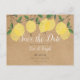 Este rústico boon botánico de limones que ahorran la tarjeta de fecha presenta un guión elegante que ahorra la fecha por encima de los detalles establecidos en la tipografía de moda. El reverso tiene detalles adicionales para guardar la fecha, incluido el sitio web del boda, con la dirección de devolución y el espacio para la dirección del destinatario. Diseñado por Thisisnotme©