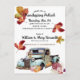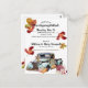 Hojas de otoño color agua, rojo naranja oxidado y verde dorado, a lo largo de esta invitación. Anclando el fondo se encuentra un rústico camión azul vintage y arreglos de calabazas, flores y follaje. Los detalles de su reunión "Friendsgiving Potluck" se encuentran en dos tipos de letra contrastantes, un guión y un sans serif pequeño, ambos en negro. Es sencillo intercambiar los detalles de su evento por nuestra información de marcador de posición. En esta invitación, puedes tomar el desayuno o la cena en lugar de almorzar. Solo pulsa "Personalizar" y empieza. Su dirección de retorno y su nota personal están en la parte posterior de la postal. De nuevo, el espaciado está en su lugar, sólo tienes que intercambiar tu información personal por la de los marcadores de posición.