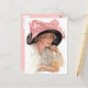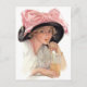 Mujer joven tomando un refresco mientras usa un gran gorra negro con un gran arco rosado. Una deliciosa escena vintage.