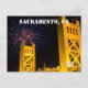 Una postal de Sacramento, CA con el clásico puente Tower con fuegos artificiales en la cabeza.