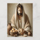 Jesús está sentado en una mesa llana, vestido con una bata blanca que fluye y una cabeza modesta que cubre, irradiando calma y compasión. Sus manos rompen un pedazo de pan, un acto que significa la Última Cena, una piedra angular de la teología cristiana que simboliza la fe, el sacrificio y el amor divino. En la mesa hay elementos simples pero significativos: dos vasos de arcilla, uno que representa la jarra de vino del pacto, y el otro que mejora la modestia de la escena. Una cesta tejida, llena de panes, simboliza la abundante provisión y bendiciones de Dios. La expresión serena en la cara de Jesús refleja una solemnidad espiritual profunda, que lleva al espectador a este momento íntimo y sagrado. El entorno subestimado enfatiza la humildad, la reflexión motivadora sobre lo espiritual sobre lo material. Esta conmovedora representación capta el corazón de las enseñanzas de Jesús, ofreciendo un momento de contemplación sobre Su sacrificio y la unidad que inspira. Sirve como un recordatorio visual del amor y la devoción encarnados en la Eucaristía, inspirando una fe más profunda y un sentido de paz para todos los que reflexionan sobre este poderoso y atemporal acto de gracia.
