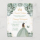 Esta elegante y glamurosa invitación de cumpleaños para dulces dieciséis presenta a una hermosa princesa con cabello moreno en un vestido de gala verde salvia. El texto combina letra manuscrita y fuentes sans serif modernas para un look clásico y sofisticado. Los arreglos florales, la mariposa y el confeti dorado crean la mezcla perfecta de rústico y chic.